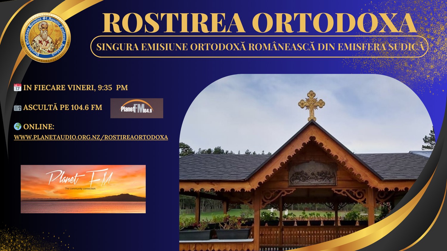 Each week Rostirea Ortodoxa builds cultural bridges for Romanians in N.Z. under the auspices of the Romanian Orthodox Church. The programme celebrates Romanian national events, talks with local Romanian personalities and presents stories for children, music, poems, community and church news, religious services, secular and sacred music.